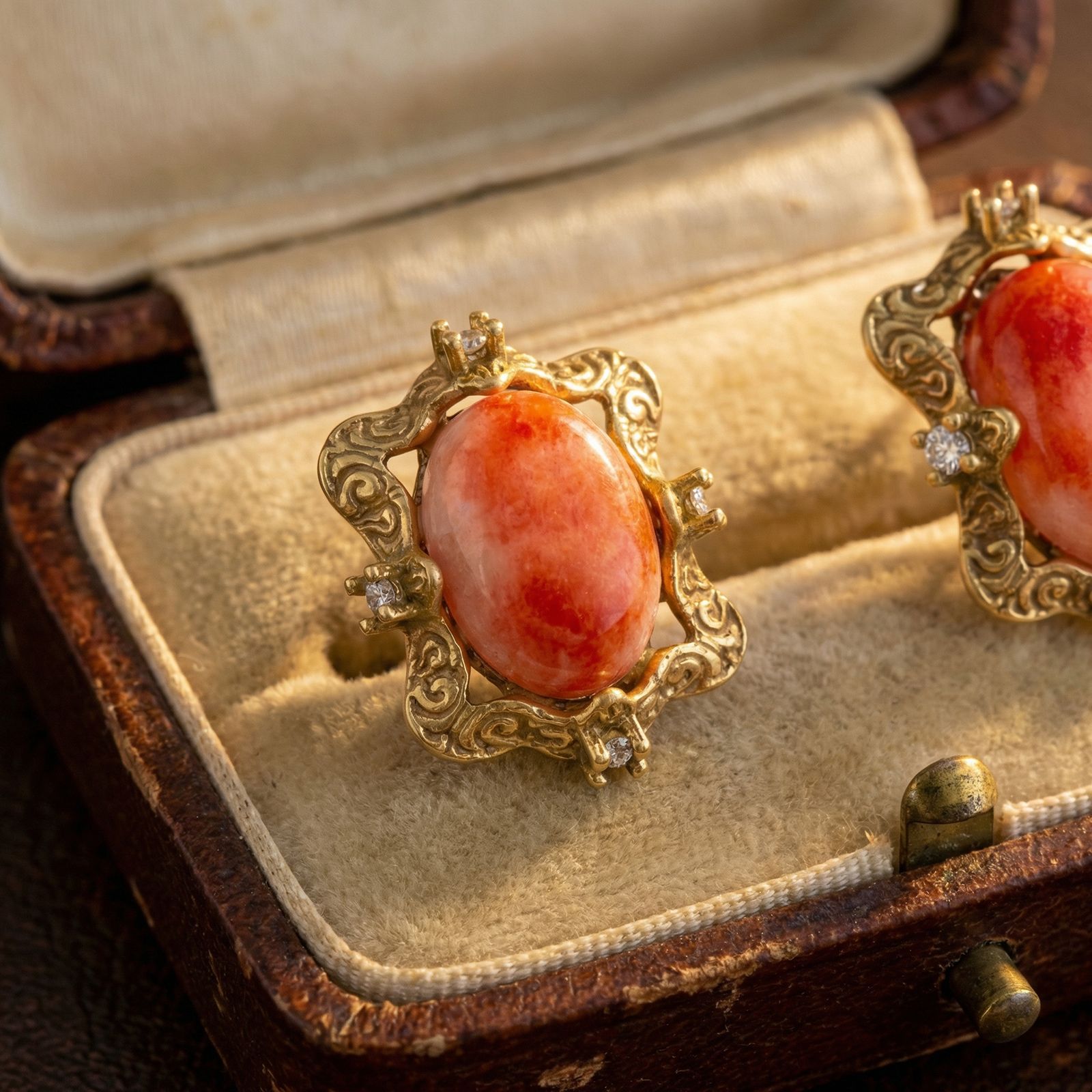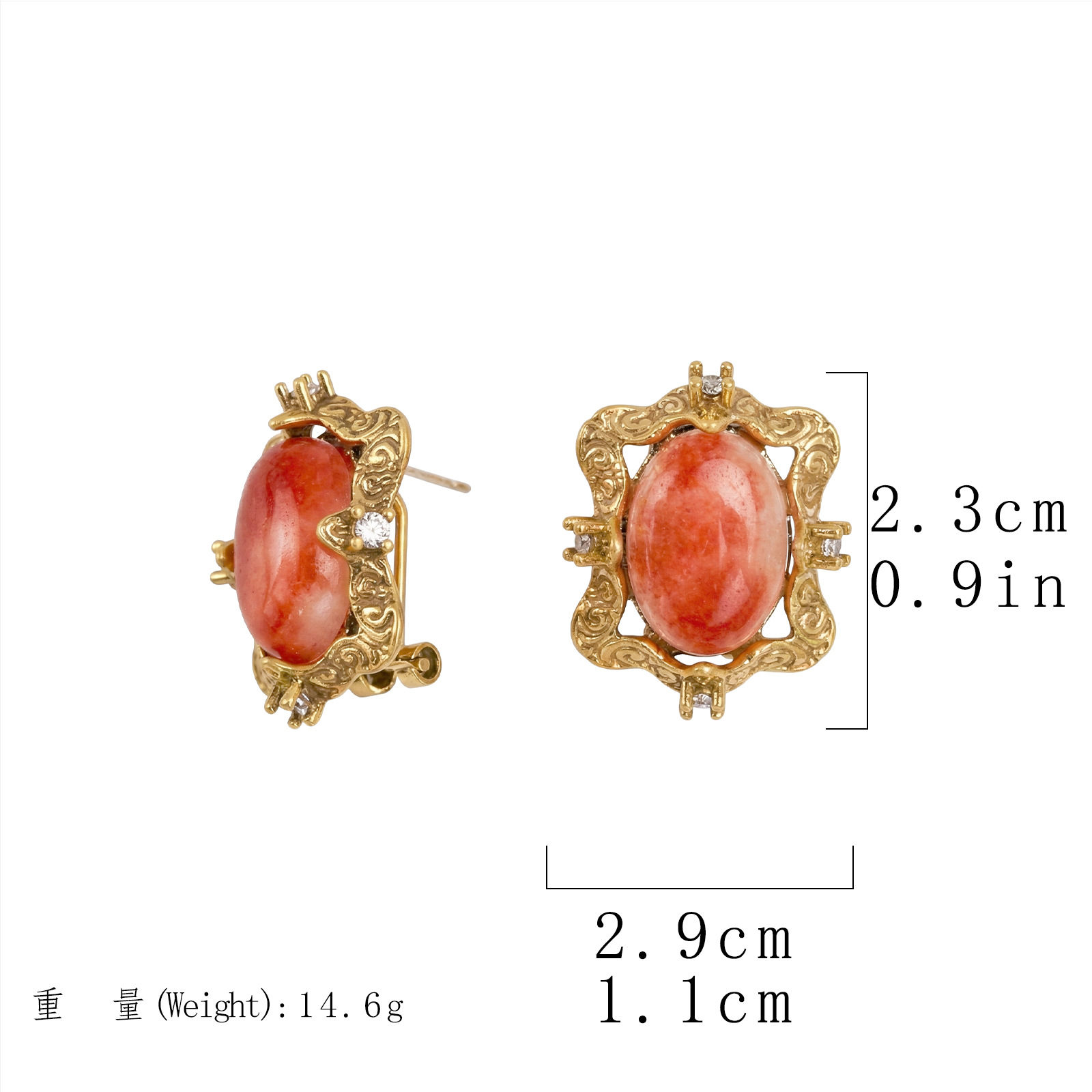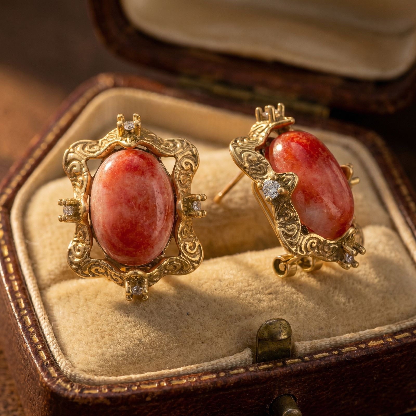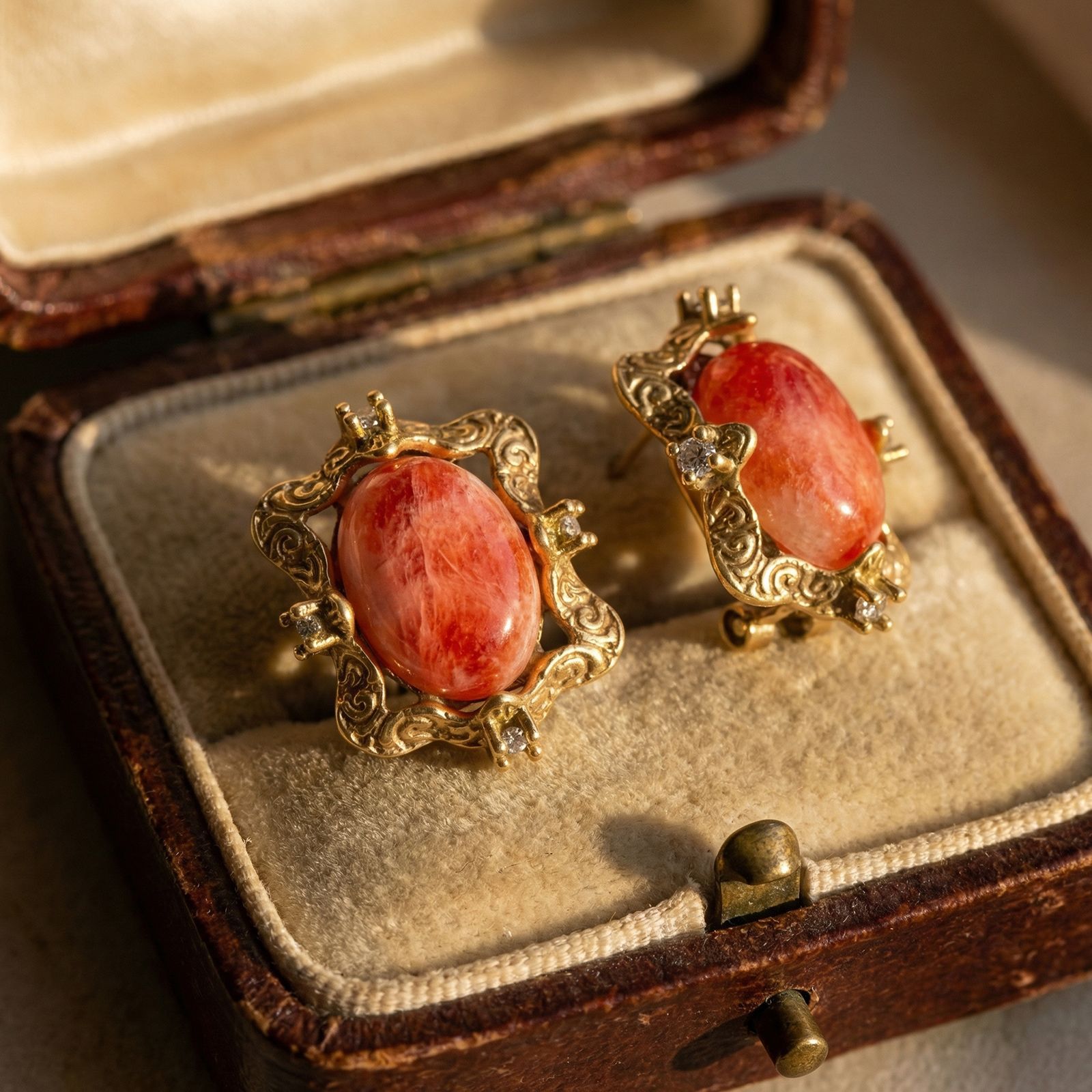 Rhodochrosite, the stone of love and compassion, takes center stage in these exquisite earrings. The delicate carving adds texture and depth, while the surrounding crystals amplify its natural pink glow. A sophisticated choice for the woman who values detail and romance.